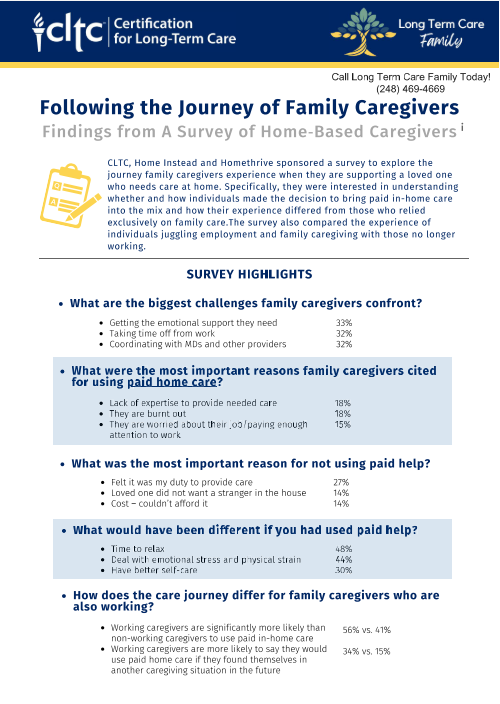 Download our free informational eBook to follow the journey of family caregivers through a survey of 400 family caregivers and their impact on taking care of a loved one.